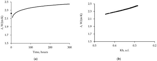 Thermal conductivity (λ) as a function of time (a) and hydrate coefficient (b) in sand sample 1 during pressure decrease to below equilibrium.