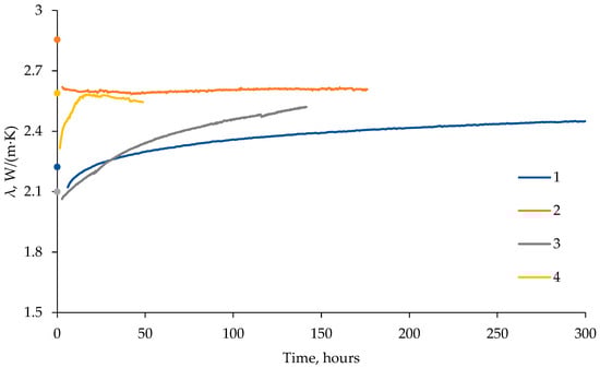 In run 1, thermal conductivity became 10% higher upon hydrate dissociation: from 2.25 to 2.45 W/m·K. However, it remained almost the same in run 2 (2.60 W/m·K), as the dissociation was incomplete and did not exceed 16% when the equilibrium pressure decreased to 1.5 MPa at −6 °C and then increased. In run 3, on the contrary, thermal conductivity changed from 2.1 to 2.5 W/m·K, as the ice and hydrate saturation values were lower (~56% of pore hydrate converted to ice in run 3 and no more than 47% in run 1), and hydrate dissociation was more rapid than in the case of run 1. The thermal conductivity increase in run 4 (saline sample) was more than 10%, from 2.3 to 2.56 W/m·K, for ~22 h. The reason was that the self-preservation effect in that sample was weakly pronounced, and pore gas hydrate dissociated rapidly. After that point, the thermal conductivity value remained at about the 2.56 W/m·K level (Figure 5).