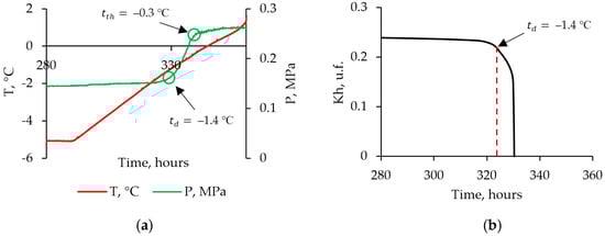 Time-dependent pressure and temperature (a) and methane hydrate coefficient (b) in sand sample 1 exposed to heating. is the temperature of pore hydrate dissociation; is the temperature of sample thawing (pore ice melting).