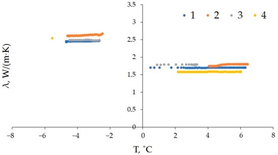 The measurements of thermal conductivity in frozen hydrate-bearing samples exposed to heating revealed two temperature ranges where it remained almost invariable after pressure decrease: from −5 °C to −2.5 °C and +0.5 to +6 °C. However, the thermal conductivity values measured between −2.5 °C and +0.5 °C were unreliable because of phase transitions (Figure 6). The thermal conductivity of sample 1 was 2.45 W/m·K in the −5 °C to − 2.5 °C range and about 1.7 W/m·K between +0.5 and +4 °C. In runs 2 and 3, the values were 2.6 and 2.5 W/m·K in the −4.5 °C to −2.6 °C interval, respectively. At positive temperatures, they were ~1.8 W/m·K from +4 to +6 °C in run 2 and about 1.8 W/m·K in the +0.8 to +3 °C interval in run 3 (Figure 7).