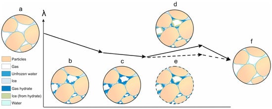 Changes in the pore space of frozen hydrate-bearing sand during hydrate formation and dissociation under heating and related thermal conductivity variations: (a) prior to hydrate formation; (b) during formation of pore gas hydrate, t < 0 °C; (c) after freezing–thawing cycles; (d) during self-preservation of hydrate, p = 0.1 MPa; (e) during dissociation of pore gas hydrate at nearly equilibrium pressure; (f) during thawing (pore ice melting).