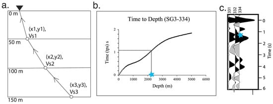 To obtain depths from the basin-converted Ps times, we incorporate the 3D shear wave velocity model produced from ambient noise tomography as part of the BASIN project, which has a depth extent of 5 km with values every 50 m [22]. The depth conversion was carried out using the P-wave velocity, Vp, S-wave velocity, Vs, and ray parameter [47]. We estimated the path through the velocity model for each station-event pair using the back-azimuth and epicentral distance. The schematic diagram in Figure 3a shows a 150 m deep velocity model with an incoming wave recorded at the surface. Within each layer, the ray passes through a specific point with a corresponding Vs value (x and y values are latitude, longitude, and Vs values are the model velocity at those points in Figure 3a). We averaged the Vs values across 10 laterally adjacent cells around those points at every 50 m depth interval primarily for smoothing and removing small-scale heterogeneities. There are instances where the model has missing Vs values within the adjacent 10 cells (500 m), and the average is computed with the available values only. Vp was obtained using an empirical equation (Equation (1)), [48]. These velocities were then used in Equation (2) [47] to calculate the estimated P-to-s time relative to the direct P, tPs at different model depths. For each station, we find the estimated tPs that most closely matches the RF tPs for the basement interface, and the corresponding depth is recorded. Figure 3b shows the estimated tPs with depth for station 334 in the SG3 line where the start of the converted phase for the basement is at ~1.1 s in the RF (Figure 3c). The corresponding basin depth is 2150 m for 1.1 s from Figure 3b.