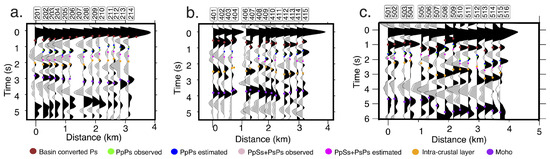 Figure 4 shows the interpreted basement Ps and PpSs + PsPs multiples along three RF profiles in the three basins. The basin-converted Ps phase is marked with brown dots for all three cases. The multiples were identified and marked with green and light pink dots, respectively. We also show the arrival times of PpPs and PpSs + PsPs multiples calculated using Equations (3) and (4), which are shown with blue and pink dots in Figure 4, respectively. The estimated and observed arrival times match, thereby verifying our interpretations. The conversions identified as an intracrustal layer and the Moho in Figure 4 are additional phases visible in the RFs.