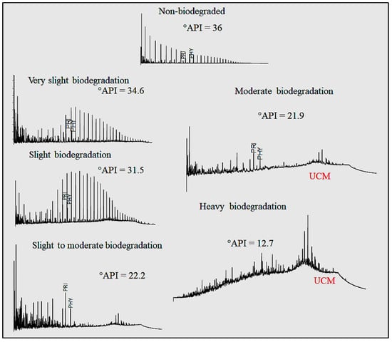 Biodegradation is a phenomenon caused by bacterial activity under 80 °C, often found in shallow reservoir conditions close to water/oil contact [6,7]. These bacteria tend to consume oil’s light compounds in the saturate fraction (preferably n-alkanes and then isoalkanes) and then consume aromatics. Further, there are resistant compounds that form complex chemical structures. They are located at the chromatographic baseline hump called the unresolved complex mixture (UCM) [1]. As the biodegradation process is initiated, UCM tends to climb, whereas the concentration of n-alkanes decreases. These observations allowed Wenger [6] to build a biodegradation scale to rank the extent of biodegradation at five biodegradation levels: very slight, slight, moderate, heavy, and severe biodegradation (Figure 1). The biodegrading bacteria begin to consume the C8–C15 alkanes, accompanied by a very slight UCMs climb. Following, at a moderate level, bacteria consume the most part of n-alkanes (nC15+); however, UCM presents a tenuous hump.