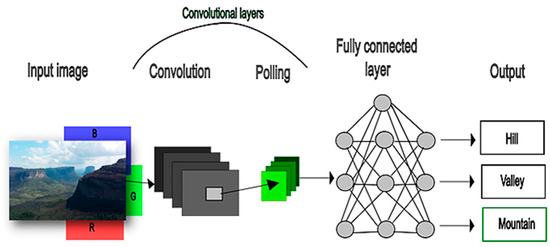 The first step in using CNN was to group the image bank according to categories (continuing the example given above, hill, valley, or mountain) and load it into the algorithm. Subsequently, the data goes through a set of convolutional layers that work as an extractor of recurring features from the images, rearranging them in a feature map (Figure 2). Each neuron in the feature map of a given layer is connected with all neurons of the previous layer via weights (filter banks). Lecun et al. [15] state that all units in the feature maps share the same filter bank, mathematically corresponding to a convolution. To obtain more robust and less general features that can recognize patterns at any position in the image, a nonlinear (Kernel) calculation method is used. This step is called pooling layers and is responsible for reducing the variance in feature maps with distortions or translations (Figure 2). According to Lecun et al. [15], “although the role of the convolutional layer is to detect local conjunctions of features from the previous layer, the role of the pooling layer is to merge semantically similar features into one”.
