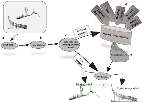 The data were processed by CNN, which measured the images (180 images) and created specific filters for each category. Next, the image classifier was trained using the results calculated by the CNN to create a robust image prediction model of the chromatograms from biodegraded oils. There is a moderate difference in the number of images for each class. Nevertheless, in the test stage, the samples were stratified to avoid any bias in the model. For that, it was necessary to find the algorithm that would present the best result (accuracy).