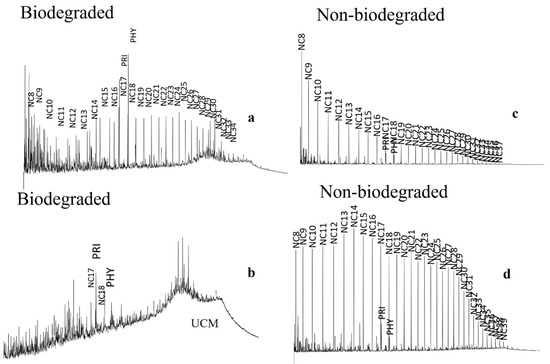 Chromatogram images used in the analysis and their pre-training classification. Figures (a,b) are chromatograms of biodegraded oil samples. Figure (a) presents the loss of light compounds (the peaks have a smaller carbon number than nC16). Figure (b) shows the total loss of light compounds in addition to the rise of UCM. Figures (c,d) are chromatograms of non-biodegraded oil samples.