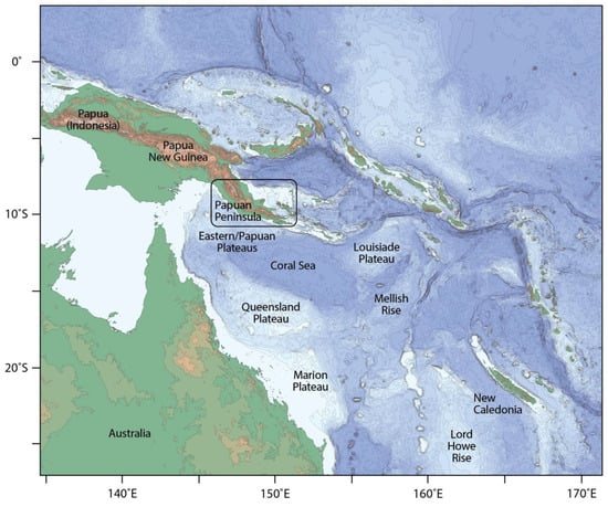 Although it is now generally accepted that New Guinea formed via accretion tectonics at the northern margin of the Australian continent, there is insufficient work to establish the origin of these terranes. Provenance studies to date have been limited in both scope and spatial distribution [,,]. Such limitations have led authors of previous reconstructions for Papua New Guinea to interpret the location of the Papuan Peninsula close to that of the present day—adjacent to northeast Australia (Figure 1)—throughout the Cretaceous and early Cenozoic [,,,,]. These reconstructions infer that the Papuan Peninsula formed together with the Eastern and Papuan plateaus of the northwest Coral Sea, and that these terranes were transported northward relative to Australia by opening of the Coral Sea in the Paleocene and early Eocene []. Such an autochthonous or para-autochthonous terrane model has formed the accepted plate tectonic interpretation for the region. This is despite the presence of a younger fossil subduction zone between the Papuan Peninsula and Coral Sea [,,]; no conclusive studies to test the link between the basement of the Papuan Peninsula and the northwest Coral Sea plateaus, nor the provenance of the Papuan Peninsula against northeast Australia have been performed.
