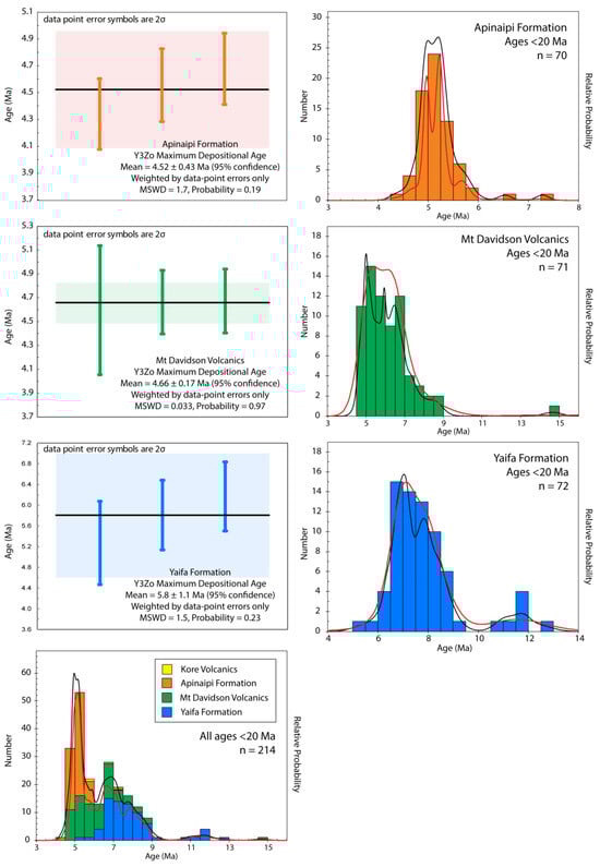Given the samples that yielded zircon grains for this study are largely sedimentary and volcaniclastic in nature, we will report the maximum depositional ages. As outlined in the previous section, we applied three different methods for reporting the maximum depositional age, the youngest single grain (YSG), the youngest three zircons (Y3Zo), and the maximum likelihood age (MLA). The latter is considered the more statistically robust of the three methods [], however, Y3Zo age is preferred in this study to represent the most geologically reasonable maximum depositional age, due to the MLA ages incorporating outlying single analytical results that lack a plausible geological justification. In Table 2 and Figure 5, we report the YSG maximum depositional age for each sample and formation, and the Y3Zo and MLA maximum depositional age at the formation level. The maximum depositional age for each formation is considered to be more important on a regional basis as opposed to individual samples that may represent only local depositional ages. Probability–density histograms for the Miocene–Pliocene age results are shown in Figure 5.