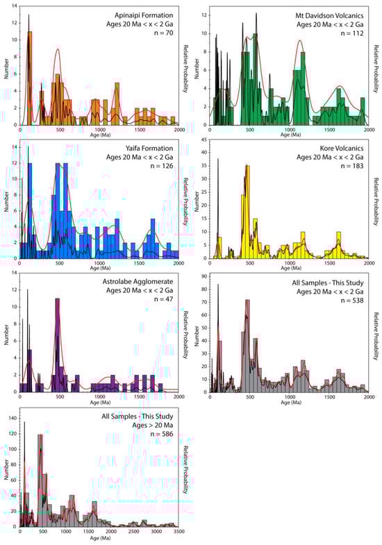 Probability–density histograms and KDE (red lines) are shown for U–Pb dating results of inherited zircon grains. Plots are presented for the Apinaipi Formation, Mt Davidson Volcanics, Yaifa Formation, Kore Volcanics, Astrolabe Agglomerate, and summary plots of aggregated U-Pb dating results for all samples in this study.