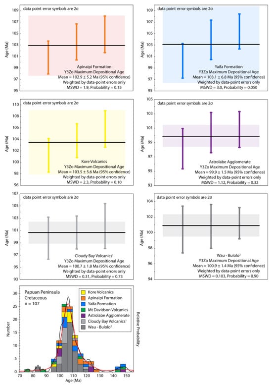 Zircon U–Pb dating results for inherited Cretaceous zircon grains of the Apinaipi Formation, Yaifa Formation, and Kore Volcanics; see Table 2 for summary results. Weighted average Y3Zo plots are constructed from zircon U–Pb calculated ages corrected for initial Th disequilibrium and 207Pb/206Pb common Pb (detailed isotopic data in Supplementary Material). Similar plots were constructed for comparison of the (1) Cloudy Bay Volcanics [] and (2) metasediments of Wau-Bulolo []. The Mt Davidson Volcanics yielded insufficient Cretaceous U-Pb ages. A probability–density histogram and KDE (red line) is shown for the aggregated Cretaceous ages of the Apinaipi Formation, Mt Davidson Volcanics, Yaifa Formation, Kore Volcancis, Astrolabe Agglomerate, and the cited sample suites from the Cloudy Bay Volcanics and Wau-Bulolo area.