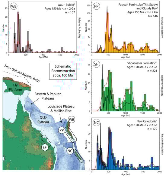 This comparison of age spectrum similarity provides consistent results, where zircon age inheritance of the Papuan Peninsula is not compatible with potential source regions of North and Far North Queensland, in that they lack significant late Paleozoic and early Mesozoic age populations, and are instead more similar to the Central Queensland Beenleigh Block, Shoalwater Formation, and New Caledonia. The Papuan Peninsula and Shoalwater Formation zircon age spectra share Ediacaran to Silurian (ca. 650–420 Ma), middle Mesoproterozoic to early Neoproterozoic (ca. 1250–950 Ma), and late Paleoproterozoic (ca. 1700–1550 Ma) age peaks, and in both sample sets the Carboniferous–Permian zircon population that is characteristic of the North Queensland Kennedy Igneous Association (330–270 Ma []) are notably absent. Previous tectonic reconstructions [,,,,] indicate that the Papuan Peninsula was positioned next to Far North Queensland at ca. 100 Ma. However, these models need to be questioned in light of the detrital zircon age data presented here. The age populations of zircon derived from the basement of the Papuan Peninsula are interpreted to have originated further south, adjacent to the Central Queensland margin (Figure 10). These findings provide a robust evidence-based provenance model that confirms that many of the terranes are allochthonous in nature and indicates that existing tectonic reconstructions require major revision.