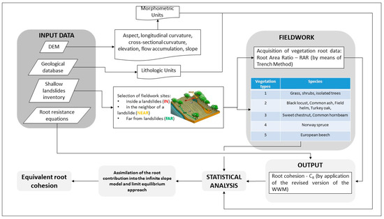 28]. Most studies focusing on the relationships between vegetation and slope stability have considered one of the aspects previously mentioned: the beneficial effect provided by the presence of root systems in the soil in terms of root density, root strength, root cohesion and root contents [