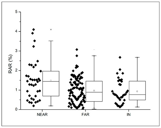 RAR distribution within the three different location types: IN, NEAR and FAR. The application of the Kruskal–Wallis test highlights that NEAR data are statistically separated from IN and FAR data populations (