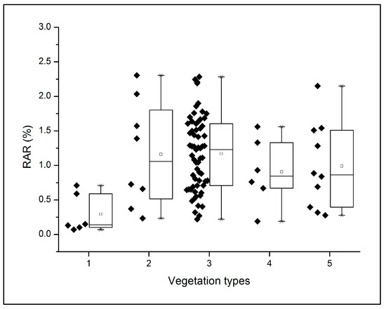 RAR data show the separation of type 1 (including grass, shrubs and isolated trees) from the other types. Type 1 values are higher than values related to herbaceous and shrub Mediterranean species [
