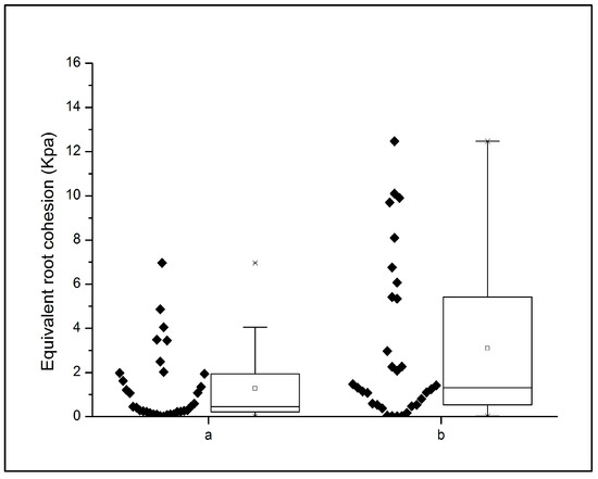 87], where the influence of the positions on both the distribution and root reinforcement in an instability-phenomena-prone landscape was studied. According to their results, topographic position significantly affected the root reinforcement, as nose locations showed significantly higher values than hollows. These results agree, in turn, with the work of Dietrich et al. [