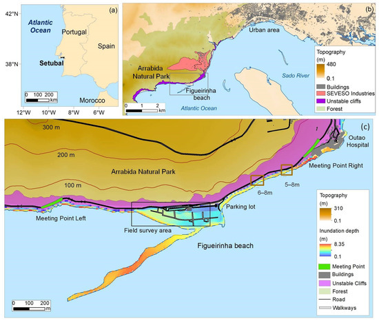 Location of the study area: (a) location of Setubal municipality; (b) Figueirinha beach located on the west part of Setubal municipality; and (c) details of Figueirinha beach. Data on tsunami inundation depth were adapted from [8]. Meeting Point Right was proposed by [8], and Meeting Point Left is a new area proposed in this study that should be used in addition to Meeting Point Right. Setubal land-use data were adapted from [5].
