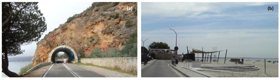 A field survey was conducted at Figueirinha beach on several occasions in 2022 and 2023. It was found that a female approximately 1.5 m in height and 75 kg in weight, thus being classified in the obesity category, took approximately 2 min and 30 s to walk the path of Route 1 (red line in Figure 2). It was not possible to walk through the tunnel because this road was closed due to the danger of rock falls (Figure 3a).