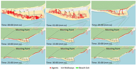 At 35 min after the earthquake, the time that corresponds to the arrival of the first tsunami waves [8], there are no people left at the beach or the parking lot in all the scenarios (Figure 4).