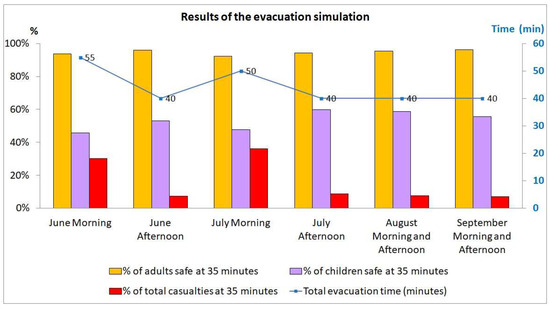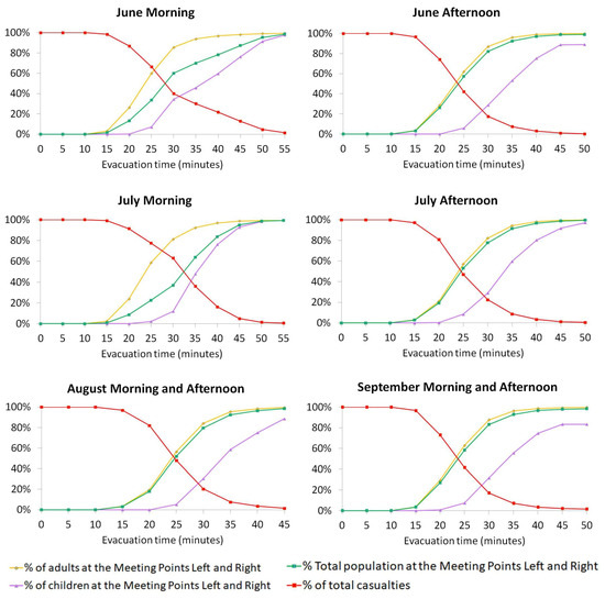 A comparison of the results presented in Figure 5 and Figure 7 shows that evacuation to Meeting Point Left is faster than evacuation to both sides or to Meeting Point Right: the first children arrive at the safe area within 25 min (9.4% to the left and 7.1% if they evacuate to both sides) and within 30 min if they evacuate to the right (0.3%). On the other hand, the first adults arrive at the safe area within 15 min (4.4% to the right and 3.1% if they evacuate to both sides) and within 20 min (1.8% to the right).