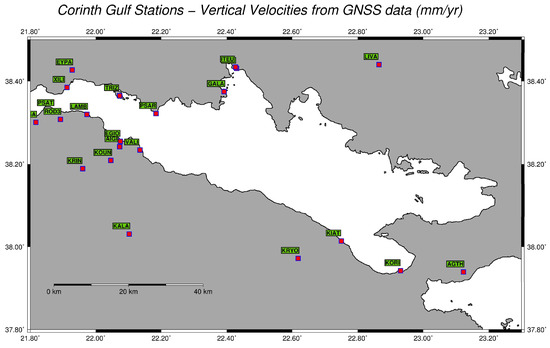 Dual-frequency geodetic data can be utilized to obtain position time series for tectonic studies. The geodetic data comprise a 3D set of secular velocities provided by permanent GNSS observations from twenty (20) stations around the Gulf of Corinth (Table 1; Figure 2). The use of GNSS, and particularly the Global Positioning System (GPS), has been used to study the long-term crustal deformation occurring at regional or local scales throughout Greece by use of the analysis of position time series of daily solutions [19,59,60]. Around the Gulf of Corinth, most of the permanent GNSS stations were installed in the early 2000s, and they were continuously occupied over ten (10) years; thus, accurate secular velocities (East, North, Up components) were obtained [19,59].