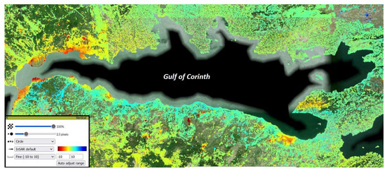 Vertical ground motion map in the Gulf of Corinth area [73]. Color scale is −10 to +10 mm/y (red to blue; red indicates subsidence).