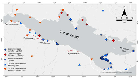 In terms of tectonic style, the Gulf of Corinth has been identified as a half-graben whose southern coasts have undergone uplift and whose northern ones have been subjected to subsidence, as it was characterized by the presence of landforms that reveal this trend [15,55,56]. In this review paper, we focus on tectonically driven sea-level changes in the Corinth Gulf. We mainly focus on case studies of earthquake-driven coastal changes, where impacts of past earthquakes can be traced mainly through tidal notches but also through biological indicators. For this purpose, an extensive bibliographic review was accomplished, and a geodatabase was developed with the main sea-level indicators of the Corinth Gulf for the Holocene. The tectonic movements that have affected the gulf during the Holocene were concluded not only through geomorphological, archaeological and biological indexes, but geodetic data as well, which were based on permanent Global Navigation Satellite System (GNSS) observations collected from permanent stations around the gulf. Data that arose from both types of surveys were calibrated based on modern data (see Section 2).