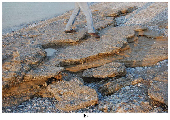 (a) Uplifted carbonate rocks bearing Lithophaga and other mollusk shells at Lechaion (Photograph: Niki Evelpidou, 30 July 2010); (b) Slightly uplifted beachrocks at Lechaion (photograph: Niki Evelpidou, 12 February 2012).