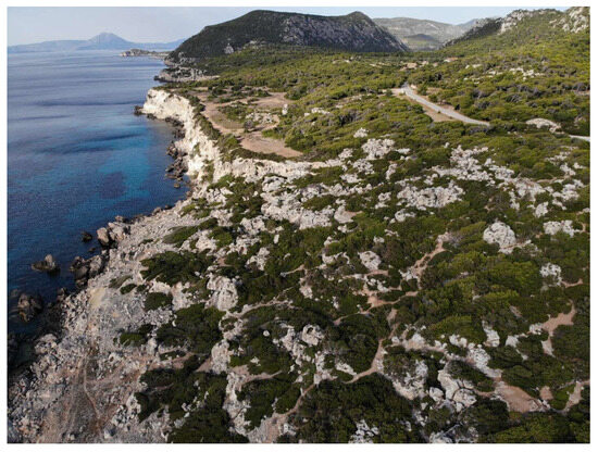 Perachora Peninsula is located in the eastern part of the gulf that segregates it from the Gulf of Alkyonides. The western part of Perachora Peninsula is a deformed segment boundary between the Xylokastro and the South Alkyonides faults, which both have an approximately E–W direction [30]. In the broader area of Perachora Peninsula and Lechaion, several uplifted geomorphological and biological indicators have been identified, such as beachrocks [147,148], marine terraces [29] (Figure 7), Lithophaga shells and other bioerosion marks [147,148].