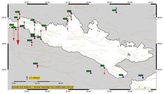 Map of the Gulf of Corinth showing trends of GNSS velocity vectors (vertical component). Sense of motion of the vector (up–down) indicates uplift (blue arrowhead) or subsidence (red arrowhead), respectively. Thin lines are active faults (NOAFAULTs database; [182]). Red boxes indicate the location of stations.