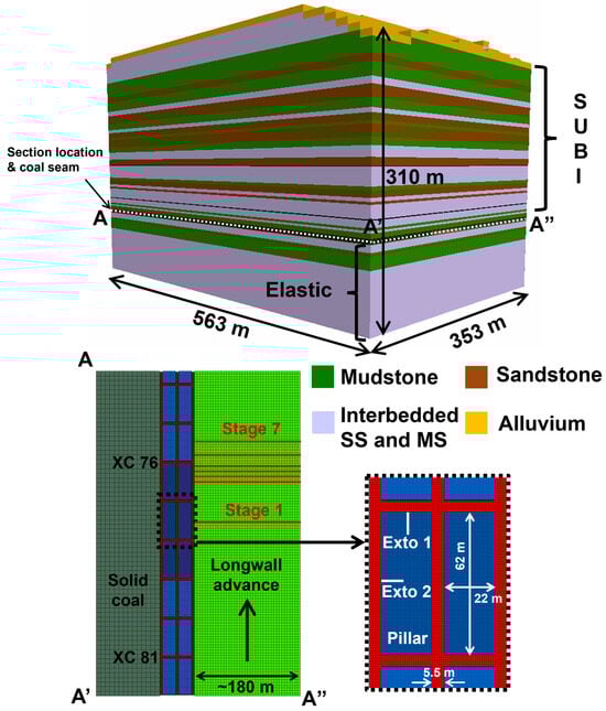 For the site under consideration, reliable rock mechanics data such as in situ stress measurements and the strength and deformation properties of the roof and floor lithologies or coal seam were not available. Consequently, all of these parameters had to be estimated. The roof layers were simulated using the strain-softening ubiquitous joint constitutive (SUBI) model [] with the parameters taken from a paper by Tulu et al. [] that provides practical estimates of SUBI input parameters for various coal measure rocks. The layers below the coal seam were modeled as elastic, as heaving issues or floor damage were not observed at the site. Discontinuum interfaces were also placed on either side of the coal seam to allow for the coal seam to slip relative to the immediate roof and floor layers. Slippage along lithological boundaries is probably important at the entry scale but is unlikely to have any major effect on the stress distribution process at the panel scale [,]. The presence of ubiquitous joints in the roof does, however, partially account for failure and slippage along bedding planes in the overburden. All entries in Mine A were supported by passive rockbolts, but these were not explicitly included in the global model since rockbolts have minimal impacts on rock deformation in continuum models [].
