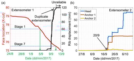 (a) Face position and displacements measured by the outermost anchor of the extensometer located in XC 77 (Extensometer 1) as a function of date; the extensometer data used for calibration are in solid black, while the data from an additional redundant extensometer located at the same position are shown by the dotted black line. (b) Displacements measured by the outermost (head) and two adjacent anchors of the extensometer located in the entry between XC 77 and XC 78 (Extensometer 2) as a function of date. The head is 0.2 m long, and Anchors 1 and 2 of Extensometer 2 are located 0.3 m and 0.9 m from the end of the head. Anchors 1 and 2 of Extensometer 1 are spaced differently and located at 0.2 m and 0.5 m from the end of the head.