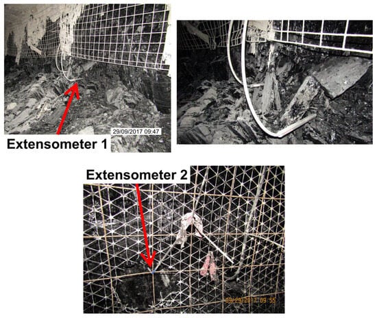 Two six-anchor multipoint extensometers were installed horizontally at the mid-height of one of the chain pillars when the longwall face was operating in the next panel (Figure 1). The instrumented panel was ~360 m wide and ~6500 m long. At the instrumented site, the overburden depth was ~250 m, the height of the coal seam was ~3.5 m, the entry and cross-cut widths were ~5.5 m, and the pillars dimensions were 62 m × 22 m. No intrinsic rib supports were used in any part of this panel.