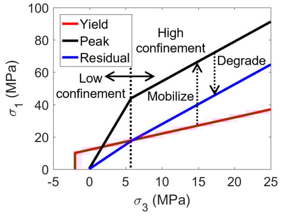The progressive S-shaped yield criterion consists of three major thresholds: (1) Yield threshold, (2) Peak threshold, and (3) Residual threshold. All three thresholds can be sub-divided into a low-confinement (spalling) section and a high-confinement (shearing) section (Figure 4). The low-confinement section of the Yield threshold is commonly known as the Crack Initiation threshold, while the low- and high-confinement sections of the Peak threshold are commonly known as the Spalling Limit and Crack Damage thresholds [], respectively. In this study, the yield criterion was slightly modified from Sinha and Walton [], in that the requirement that all high-confinement sections should coincide at a particular confining stress was omitted. Such a modification was introduced based on Sinha et al. [], which shows that the effective Yield threshold does not necessarily bend upward for coal. Therefore, the bi-linear shape of the Yield threshold was replaced by a straight line, which evolved to a bi-linear Peak threshold and then degraded to a Residual threshold. The high-confinement section of the Residual threshold was assigned the same friction angle value as that of the high-confinement section of the Peak threshold. Figure 4 illustrates the yield criterion in a σ1−σ3 space.
