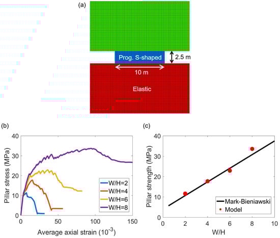 (a) Model geometry for W/H = 4, (b) stress–strain curves for W/H = 2–8, and (c) peak pillar strengths for W/H = 2–8 compared to Mark-Bieniawski pillar strength equation.