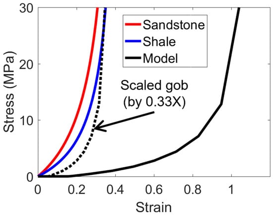 Interestingly, if the strain of the modeled gob curve is scaled by a factor of 0.33, which is analogous to having three gob elements stacked on top of one another (or a caving height of three times the mining height), then the curve moves close to the “Shale” curve from Pappas and Mark []. This is not surprising, given that there are several mudstone layers and interbedded mudstone and sandstone layers present in the overburden (Figure 1).