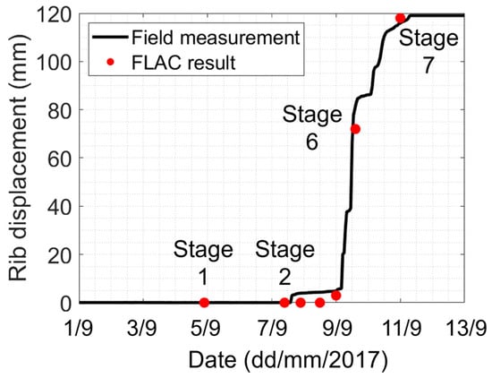 With the overburden and gob parameters constrained, the next task was to adjust the coal pillar parameters obtained in Section 3.1 to match the displacements measured by Extensometer 1 (Figure 2). Each model took about 4–5 days to complete on a machine with an 8-core 3.6 GHz Intel i9-9900K processor and 64 GBs of RAM. During model calibration, the right side of the progressive S-shaped criterion was kept unchanged, as these parameters did not significantly impact the progression of the low confinement damage along the pillar periphery. Changes were made iteratively to the cohesion of the Yield threshold, the friction angle of the Peak threshold, the friction angle of the Residual threshold, and the dilation angle. Table 4 lists the final calibrated coal pillar parameters, and Figure 8 shows the model-predicted displacements. It can be seen that the model was able to reproduce the start (Stage 5) and the end (Stage 7) of the main displacement increase very well. In the early stages (Stages 2–5), the extensometer shows a ~5 mm movement but the model shows ~0 mm; though this may seem like a mismatch, the model is quite consistent with the “duplicate extensometer” data in Figure 2a. A slight mismatch in displacements (~8 mm) also occurred at Stage 6, but this difference was not practically significant given the uncertainty in the position of the longwall face on different measurement dates and the overall brittleness of the deformation process.