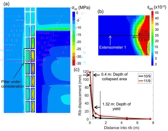Before presenting any discussion on why changes in the coal parameters were required, the concepts of the “depth of yield” and “depth of collapsed area” in the FLAC3D model need to be introduced. Figure 9b shows the critical plastic shear strains in the FLAC3D model at Stage 7, and Figure 9c shows the rib displacement as a function of distance into the pillar for Extensometer 1. The Residual threshold is attained in the FLAC3D model at a value of 0.045, and the corresponding contour could be interpreted as approximately corresponding to the edge of the collapsed region (1 m). The point where becomes minimal/negligible (1.5 m) is the edge of the yielded region. From this figure, it is clear that the damage is much more localized in the field when compared to the FLAC3D model. The FLAC3D plastic strain was also more pronounced in the upper parts of the pillar, as was observed at Mine A (Figure 3).