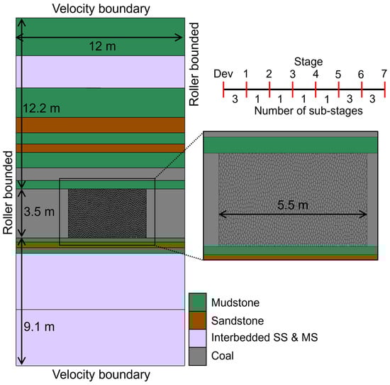 In the FLAC3D model, once the in situ stresses were initialized, the entry was excavated, and the model was brought to an initial state of equilibrium. After this, the position of the longwall face was advanced in seven stages (Figure 1), and the model was brought to mechanical equilibrium after every stage. To advance the longwall face and simulate the strain-hardening response of gob, the mined portion of the coal was replaced by a strain-softening Mohr–Coulomb material whose cohesion was updated continuously as a function of the critical plastic shear strain [].
