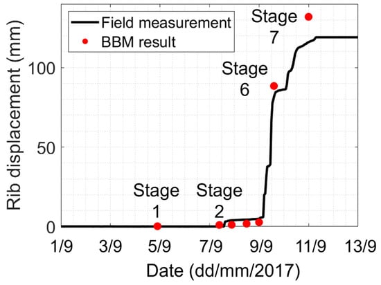 A manual back-analysis approach was conducted, whereby the input parameters were systematically modified through trial and error until the BBM rib displacements matched those recorded by Extensometer 1. The general calibration approach used has been discussed by the authors in a previous study []. Figure 12 compares the rib displacements from the calibrated BBM and the field measurements, while Table 5 lists the calibrated parameters. The model was able to capture the rapid rise in displacement after Stage 5, but slightly overestimated the displacements at Stage 7. It was found to be difficult to constrain the displacements at Stage 7 without affecting the data–model fit at Stage 6. The authors believe that this is related to the size of the Voronoi blocks chosen (block width of ~0.07–0.08 m) relative to the deformation being targeted in the calibration.