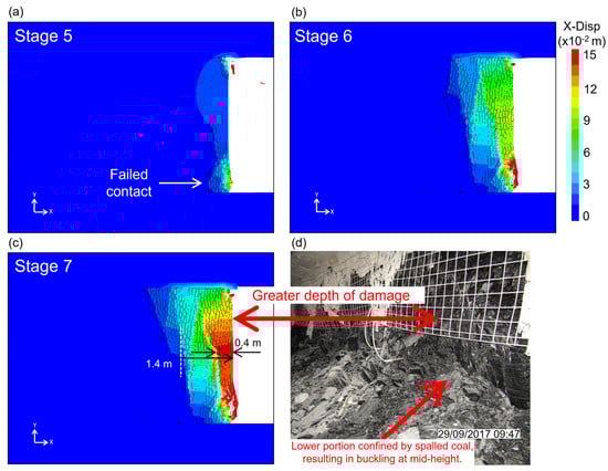 Progression of failure and increase in deformation from (a–c) Stages 5–7, (d) State of the coal rib on 29/09/2017.