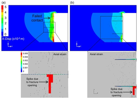 The behavior of the floor case was more interesting and counterintuitive (Figure 16c) in that there was an increase in the fracture depth in the bottom half despite the rockbolt being installed in the bottom half of the rib. Sinha and Walton [] presented similar observations in the context of a granite pillar case study, where the depth of fracturing along one of the pillar edges was larger in a three-bolt case in comparison to an unsupported case. This was explained by the stiffening of the fractured zone by the rockbolt, allowing for the damage to propagate deeper into the rib. In that same study, when the outer bolts were moved closer to the host units (i.e., outward), the fracture depth was reduced. With that in mind, a separate variation of the floor case was simulated, where the rockbolt was translated to 0.5 m from the floor (Figure 16d). This had a dramatic influence on the overall depth of damage and bulking along the rib, which is consistent with the findings of Sinha and Walton []. The effect is more prominent here due to the anisotropic nature of the rock mass (i.e., elongated blocks) that permitted the rockbolt to bind the layers more effectively and suppress the initiation/growth of fractures from the floor. The effective suppression of fracture growth close to the source and the dominance of fracturing in the bottom half of the rib (Figure 13a) explains the notable stabilization observed in the upper portions of the rib (Figure 16d).