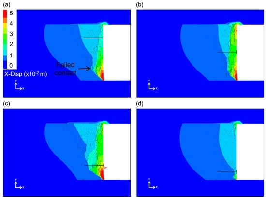 BBM displacements at Stage 7 with addition of one rockbolt in (a) upper half of the rib, (b) mid-height of the rib (same as in Figure 15a), (c) lower half of the rib, and (d) lower than in (c).