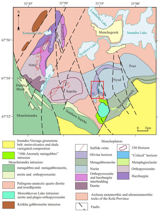 The Paleoproterozoic (ca. 2.5 Ga) ore-bearing Monchepluton is located in the southern of the Archean Kola Province (Figure 1), within the northeastern part of Fennoscandian Shield. The Monchepluton is a complex layered mafic–ultramafic intrusion consisting of several blocks divided by tectonic faults. They are traditionally referred to as different intrusions with their own names. Generally, the Monchepluton includes seven independent intrusions, for example, Nittis, Kumuzhya, Travyanaya, Sopcha, Nyud, Poaz, and Vuruchuaivench (Figure 2). Despite its relatively moderate size (approximately 50 km2), the Monchepluton has a considerable ore potential. It combines nearly all types of deposits that are typical of layered intrusions. These are chrome, sulfide platinum-group elements (PGEs)-Cu-Ni, and low-sulfide Pt-Pd ores alongside rich vein Cu-Ni ores that are unusual for such intrusions [1,2]. The Monchepluton sulfide PGEs-Cu-Ni and low-sulfide Pt-Pd deposits are divided into two structural types, i.e., basal ones constrained within lower margin parts of intrusions and reef stratiform ones [3]. Despite long-term research on the Monchepluton, some issues regarding its geological structure need additional research. For example, it has long been believed that the Monchepluton had intruded as a result of a single pulse of mafic–ultramafic magmatism [1,4].