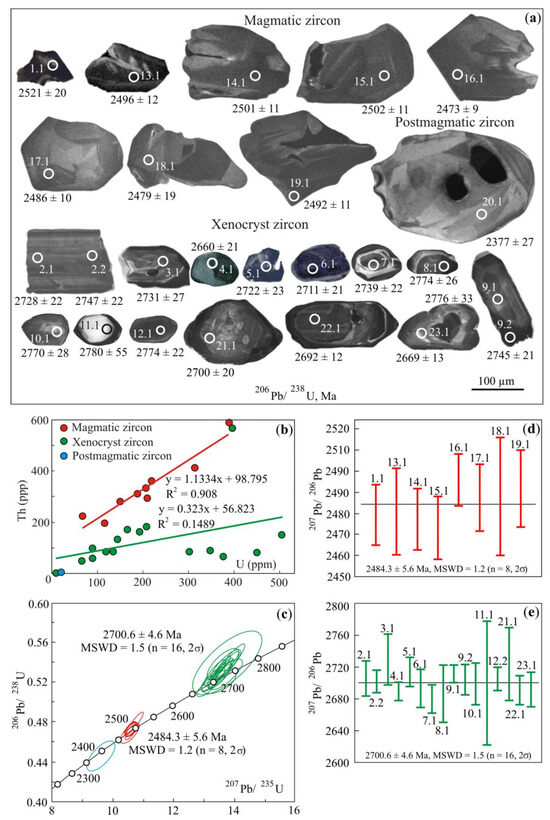 For the second zircon population, significant variations in U and Th contents are determined in ranges of 10–505 ppm and 1–567 ppm, respectively (Table S1), with no correlation observed between them (Figure 6b). The average contents are as follows (n = 16): U = 225 ppm, Th = 130 ppm, and Th/U = 0.58. This zircon population has a concordant and weighted average 207Pb/206Pb age of 2700.6 ± 4.6 Ma (MSWD = 1.5, n = 16) (Figure 6c,e). The concordant age is confirmed by the intersection of the Concordia plots by all ellipses of analytical errors, as well as by the low value of the degree of concordance, varying from −3.1 to 0.9 (Table S1). The obtained results indicate that zircons of the second population are xenocrystic and were probably captured from rocks of the Archean greenstone belt.
