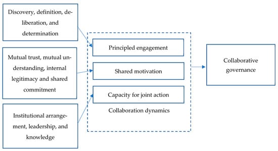 Depicted in Figure 2, these factors include (1) the principles of engagement (discovery, definition, deliberation, and determination), (2) shared motivation (mutual trust and understanding, internal legitimacy, and share commitment) and (3) the capacity for joint action (institutional arrangement, leadership, and knowledge) [50].