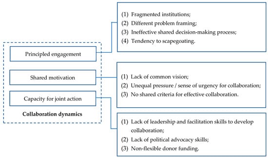 The three main components within the collaboration dynamics frame were used to group the identified barriers to effective collaboration. These are (1) principled engagement, (2) shared motivation, and (3) the capacity for joint action. Figure 3 details ten specific sub-components (hurdles) mapped against these main barriers. Each of these are examined and discussed in detail in the following section.
