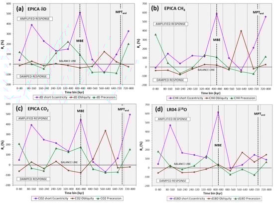 Analysis of the orbital response sensitivity during the last 800 kyr (fuchsia: short eccentricity; brown: obliquity; green: precession) according to temporal segments binned at 80 kyr from EPICA: (a) δD; (b) CH4; (c) CO2; and (d) LR04 δ18O records. The balance line (0%) indicates that the variance in the response matches the variance in forcing, indicating a self-sustained climate system that is paced only by orbital forcings. Values significantly larger than zero indicate a reinforcement of the response signal. Negative Rs indicates a response variance lower than the orbital forcing, suggesting a damping mechanism for the climate system. Note the impressive asymmetry of the climate responses with extremely robust amplitude magnifications and moderate damping. Scale of the y-axis up to −200% for graphical requirements. MBE = Mid-Brunhes Event; MPT = Mid-Pleistocene transition. SSA components data are acquired from EPICA [26], LR04 [8]. Nominal solutions are from Laskar et al. [37] and Laskar et al. [38].