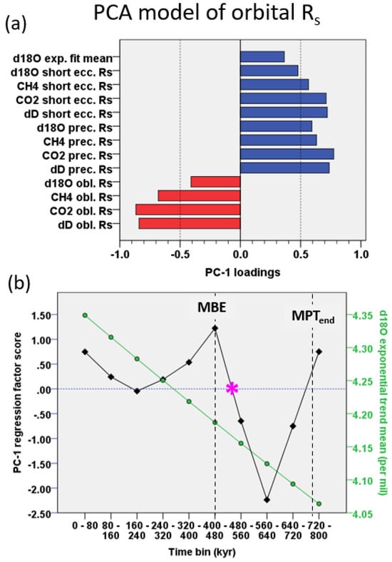 Standardised PCA model of EPICA δD, CO2, CH4, and LR04 δ18O orbital Rs during the last 800 kyr, binned at 80 kyr: (a) PC-1 loadings; (b) PC-1 regression factor score (black line), and δ18O exponential trend mean (green line). The asterisk indicates the transition to MBE. MBE = Mid-Brunhes Event; MPT = Mid-Pleistocene transition.