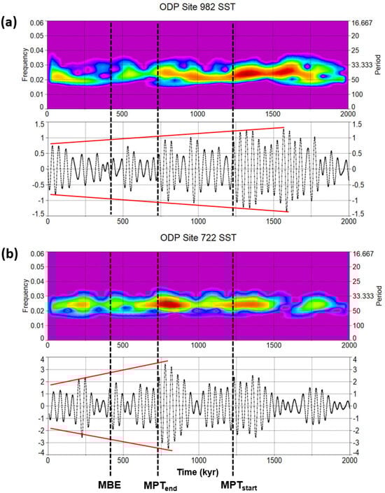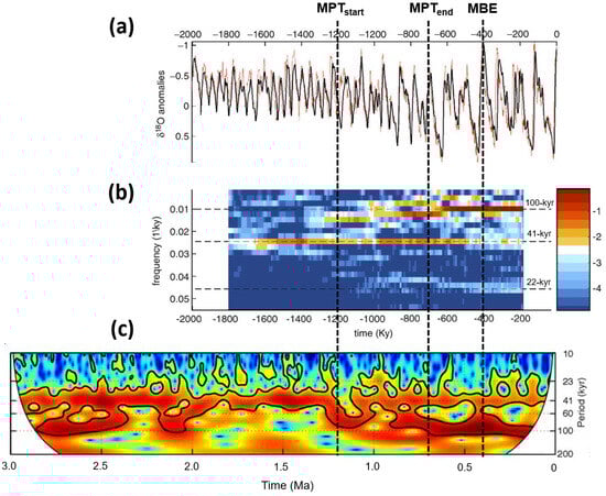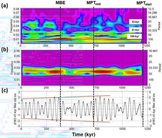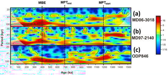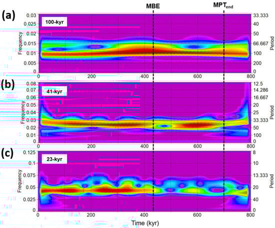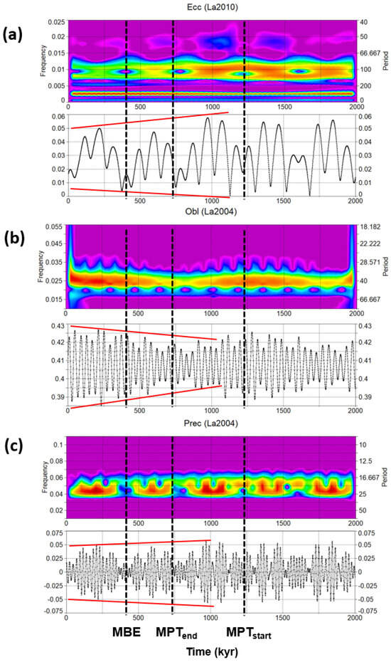 Morlet wavelet power spectra of EPICA SSA stacks: (a) short eccentricity; (b) obliquity; (c) precession. MBE = Mid-Brunhes Event; MPT = Mid-Pleistocene transition. Data from Viaggi [26].
